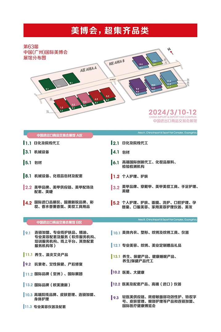 2024年CIBE美博會展會檔期一覽表2024.3.10-12 第63屆廣州春季美博會2024.3.27-29 北京國際美博會2024.6.19-21 第 64屆上海國際美博會2024.8.3-5 北京國際美博會2024.9.4-6 第65屆廣州秋季美博會2024.11.7-9 深圳國際美博會展參咨詢:李玲 15O OOO2 545O中國國際美博會(以下簡稱”美博會") 由馬婭女士創辦于1989年, 立足廣州,布局上海、北京、深圳,年展覽面積超100萬平方米,年觀展人次逾250萬,年策辦專業論壇活動逾500場,成為全行業探索商機、鏈接資源的前沿展會。進入發展的第35年,美博會以"超集美"為主題,打造更覆蓋、更精準、更整合、更賦能的"民族美業搖籃,全球展覽平臺", 煥新出發。第63屆中國(廣州) 國際美博會在廣州琶洲.中國進出口商品交易會展館舉辦,300000平方米超大展覽面積,薈萃海內外美業品牌,整合日化線、供應鏈、專業院線、電商及新渠道、美甲美睫紋繡、塑形美體、養生醫療等全產業鏈資源,打造集高效選品、合作對接、創業孵化等為一體的高質量展會。展覽面積200000平米 參展企業3000家媒體賦能300 精彩同期活動50場集全產業|超級投影場網羅美業超全產業鏈資源,數百垂直品類,數萬件品牌爆品、好品,360°展示美業全域新動態、新生態,牽線品牌、工廠及專業買家,幫助美業人一站獲取研、產、供、品、銷、渠等優質資源,直面行業z新商機。集多場景|超級整合場集結時下熱門板塊,集合多場景,特別設置綠色供應鏈、科技美容、醫學美容、醫療健康、口服美容、養生健康、快時尚穿戴美甲美睫、國際展團、電商新渠道、渠道好物等多個超級流量主題展區,供、采、營、創多場域,打造場景展銷的整合場。集.新玩法|超級營創場升級全線玩法,創新設置"展、會、賽、獎、播、宴、節、秀",策辦超50場特備論壇及精彩活動,覆蓋政策解讀、趨勢研發、新興渠道、品銷打法、創業賽道等,精準聯動美業商戶、智庫專家、平臺渠道和專業買手,線上線下同步開場,打造美業超級營創場。廣州美博會展館分布中國進出口商品交易會展館A區產品分布1.1 化及院線代工2.1 化及院線代工3.1 機械設備4.1 包材5.1包材6.1高端國際創新代工、 化妝品原料、檢驗檢測機構8.1 機械設備、 化妝品包材及配套1.2個人護理、護膚2.2 美甲品牌、美甲供應鏈、美甲配飾及配套、美睫3.2 美甲品牌、穿戴甲、美甲美妝工具、手足護理、美睫4.2 國際進口品展區、國潮新銳品牌、彩妝、香木香薰香氛、美妝工具用品5.2 個人護理、護膚、而膜、洗護、口腔護理、孕嬰童、口服美容、家用美容護理儀器、美發中國進出口商品交易會展館B區產品分布9.1 連鎖加盟、專業線護膚品、精油、專業美容配套及服務(軟件服務機構、培訓服務機構、線上平臺、QT配套服務機構等)10.1美體內衣、塑形、紋繡及紋繡工具、儀器12.1 專業美容、紋繡、美業定制贈品禮品11.1 養生、溫灸艾灸產品13.1 養生、保健產品、健康睡眠產品、養生/保健產品代工9.2 抗衰老、女性保健、產后修復11.2國際品牌(亞洲)、國際展團|10.2醫美、大健康13.2國際品牌(歐美澳新)12.2 醫美及配套產品、高端(進口)儀器10.3高端院線品牌、皮膚管理、連鎖加盟、身體護理9.3 輕醫美供應鏈、斑痘敏面部功效性護、特妝字號、皮膚管理、眼部護理等產品和連鎖加盟、國際醫療健康博覽會11.3專業美容儀器及配套趨勢論壇國際SPA大會美業人學習與成長論壇國際美甲美睫大會中國新品牌生態論壇美業一公里新鮮會一未來新品落地會綠色供應鏈大會CIBE月子產康經營峰會行業嘉年華指尖花young (穿戴甲)集市新品牌生態主題區渠道好物集市全聯美容化妝品業商會渠道商專委會一家宴化妝品工程師節原料節嘉年華互聯網焦點醫美皮膚運營大會.品牌創新大會中國短視頻直播電商峰會.直播團購獨立專場錦標賽全國大學生化妝品配方設計創新大賽CPMA美甲美睫大賽中國美業職業技能大賽美博會,超集多資源,全域精準邀約采購商:一、品牌商、美容院、醫美醫院、雙美機構、抗衰老中心、皮膚管理、醫生群體、護發養發、SPA美容、美體養生機構、養生會所、月子產康中心、減肥機構、健身房、瑜伽館、運動品牌、內衣代理及門店、母嬰連鎖、品牌服裝、形體禮儀服飾色彩搭配機構、KA/商超/CS連鎖、百貨/購物中心、代理商/貿易商等二、主流電商/跨境電商/自媒體電商、MCN機構、直機構、社群團購、淘寶C店/微店/抖音小店、線上分銷商、主播達人、團購操盤人、私域操盤手、TP/DP服務商、技術服務商、培訓機構等2024年CIBE美博會展會檔期一覽表2024.3.10-12 第63屆春季廣州美博會2024.3.27-29 北京國家美博會2024.6.19-21 第 64屆上海虹橋美博會2024.8.3-5 北京國際美博會2024.9.4-6 第65屆秋季廣州美博會2024.11.7-9 深圳國際美博會參展詳詢:李小姐 15O OOO2 545O 同V